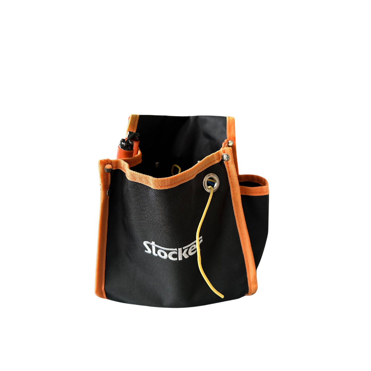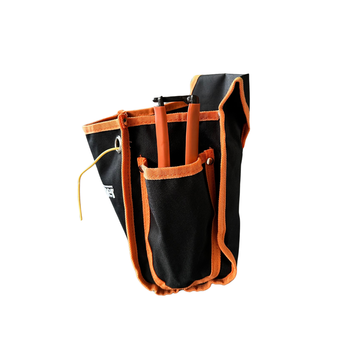 Dotato di tasche laterali per forbici e piccoli attrezzi, presenta un foro centrale per il passaggio del legaccio e un comodo passante per il fissaggio alla cintura, per lavorare in modo comodo e ordinato.